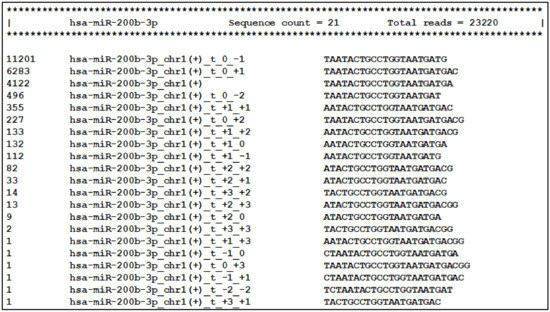 Next, the main tool of the miRGalaxy workflow—IsoRead mined the SAM mapping files to discover and classify miRs and their template and non-template (optional) isomiRs in each sample of the groups. Here the tool created detailed count matrices with identified miRs and isomiRs in each sample. Furthermore, all detected sequences produced by miR arm were collected in a database. As an example, summarization of miR-200b-3p and its isomiRs was extracted from the database and is presented in Figure 6 (representing a snapshot of the screen display).