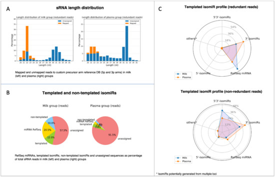 Before feeding the count matrices into the statistical tool for DE analysis, the IsoRead module outputs an isomiR profile report with several summarization charts for each of the analyzed dataset groups (Figure 7). The first chart provided in the isomiR profile report represents the length distribution of sRNA reads by sample groups (Figure 7A). Sequences of length between 20 nt and 35 nt are shown, and the percentage of mapped and unmapped reads is color coded. The length distribution profiles of the two analyzed groups exhibit a peak at 22 nt characteristic for miRs. In general, high peaks corresponding to the lengths of certain RNA species should be distinguishable: miRs should form a narrow peak around 20–22 nt. If there are no clear peaks, this may suggest an issue related to RNA quality and degradation. A pie chart depicts the percentage distribution of the identified RefSeq miRs, template and non-template isomiRs, and unassigned reads in each group (Figure 7B). These charts enable the user to obtain information about the relative quantities of miRs in each group; in our case, reads that have been assigned to miRs and isomiRs were 42.5% in the milk group and 8.5% in the plasma group. Furthermore, spider diagrams reflect the distribution of the different subtypes of the template isomiRs (3′-isomiRs, 5′-isomiRs, and 5′3′-isomiRs) in redundant and non-redundant datasets (Figure 7C), giving an idea of the sequence diversity in datasets.