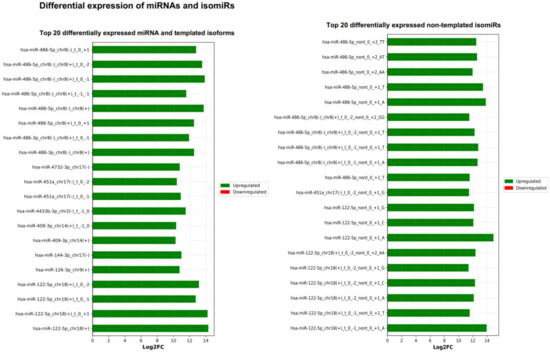 Next, the DE result files were forwarded to our third tool—miRViz, which renders customized charts within a PDF report (Figure 8 and Figure 9). Users can set a cut-off and display the top differentially expressed entries with separate charts—one for RefSeq miRs and template isomiRs and another one for non-template isomiRs (optional in the workflow). Furthermore, we provide a summary chart of the miR arms with all assigned miR and isomiR species associated with log2FC. In our case datasets, we have identified a total of 3627 sequences DE in the plasma samples, of which 268 are RefSeq miRs, 1014 template isomiRs, and 2346 non-template isomiRs. With the help of the miRViz tool, we have generated a custom chart of the top 20 DE miRs and isomiRs grouped by arms (Figure 9). The most upregulated RefSeq miRs in plasma were miR-122-5p (log2FC 14.3) together with its isomiR miR-122-5p_t_0_+1 (log2FC 14.2) and the most downregulated RefSeq miRs were miR-200b-3p (log2FC −9.2) and miR-200a-5p (log2FC −7.4) and from isomiRs were miR-30a-3p_t_0_−2 (log2FC −8.5) and miR-200b-_3p_t_+1_+1 (log2FC −8.2). Recently, several studies observed that the circulating miR-122-5p was highly expressed in plasma [36,37,38] and miR-200a, miR-200b, and miR-30a were highly expressed in milk [39,40]. Interestingly, miRGalaxy discovered a much greater number of DE miRs and isomiRs with statistical significance (p-adj < 0.05) and |Log2FC| ≥ 1 in comparison to the original study [34]. For example, outputs from the two analyses of miR-200b-3p and isomiRs are shown in Table 2.