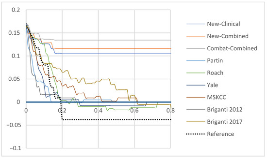 The ComBat-Combined model reduced the risk of FN to 3.3% while correctly avoiding the risk of eLND for 88 (96.6%) patients, with the 19% cut-off. Among the 21 patients classified above the 19% cut-off, 76.2%% had a proven LNI resulting in a specificity (Sp) of 89.4%. Detailed results of each model are available in Table S7. Patients classified above the 19% cut-off using the ComBat-Combined model were 23.1 times more likely to present a LNI, respectively (Supplementary Table S8). For comparison, the second best relative-risk ratio, apart from the New-Clinical and New-Combined models, was 8.2 (MSKCC). Finally, DCA revealed that the newly developed models improved LNI risk prediction when compared to other models (Figure 1). Similarly, calibration plots showed a calibration as satisfactory as the Briganti 2017 and the MSKCC nomograms (Supplementary Figure S2).
