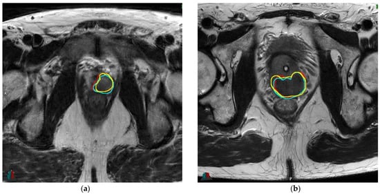 Example of variations of delineations for two patients: (a): 56.2 yo, cT2a, PSA 7.7 ng/mL, Gleason 3 + 4 (ISUP 2), respective DICE overlap coefficients with V.B (reference): 0.85 (F.L) and 0.83 (U.S); (b): 67.4 yo, cT1c, PSA 1.8 ng/mL, Gleason 4 + 4 (ISUP 4), respective DICE overlap coefficients with V.B (reference): 0.83 (F.L) and 0.81 (U.S). Abbreviations: yo: years old, PSA: prostate-specific antigen, ng: nanograms, mL: millimeter, ISUP: International Society of Urological Pathology. Red: delineation #1 (V.B), cyan: delineation #2 (F.L), yellow: delineation #3 (U.S).