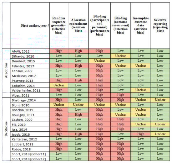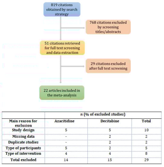 Two independent reviewers (M.S.-R. and J.L.) independently screened all the titles and abstracts and evaluated each article based on the eligibility criteria. Disagreements were resolved by consensus and in concordance with a third reviewer (P.M.), when necessary. Studies that fulfilled the following criteria were included: (1) newly diagnosed AML patients’ cohorts in which azacitidine or decitabine was prescribed upfront and (2) studies reporting efficacy and outcome variables.