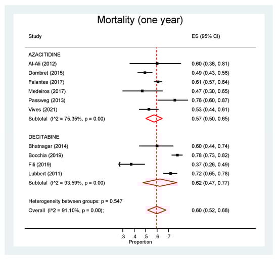 Regarding 1-year mortality (Figure 3), we found no significant difference between azacitidine (57%, 95% CI: 50–65%) and decitabine (62%, 95% CI: 47–77%) (p = 0.547). However, again high heterogeneity was observed between studies, being over 75% for both agents.