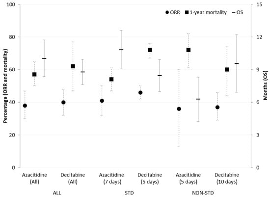 Again, no significant differences were found when the 5-day (approved) and 10-day regimens of decitabine were compared regarding the ORR (46%, 95% CI: 42–50% vs. 37%, 95% CI 29–46%, p = 0.088). We found no significant differences in mortality and the OS either.