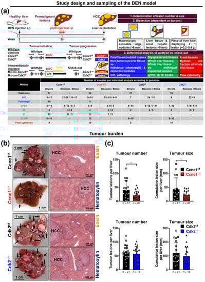 This study used transgenic C57/BL6 mice with floxed alleles of Ccne1 or Cdk2 [12,13]. To generate conditional Ccne1 or Cdk2 knockout animals, mice were crossed with transgenic mice expressing Cre-recombinase under control of the Mx1 promoter [14] as described earlier [9]. Animals were housed in a temperature-controlled room with 12 h light/dark cycles and free access to food and water. Experiments were carried out according to the German legal requirements and were approved by the authority for environment conservation and consumer protection of the state North Rhine-Westphalia (LANUV, Germany). For HCC induction, fourteen-day-old male mice were once injected intraperitoneally (i.p.) with 25 mg diethylnitrosamine (DEN, N0756, Sigma-Aldrich, St. Louis, MO, USA)/kg body weight. DEN-treated mice received three i.p. injections of 400 µg poly-I:poly-C (pIpC, P1530, Sigma-Aldrich, St. Louis, MO, USA) for 5 consecutive days at the age of 24 weeks, inducing the deletion of Ccne1 or Cdk2 exclusively in Mx-Cre-positive littermates. Mice were analysed after week 40.