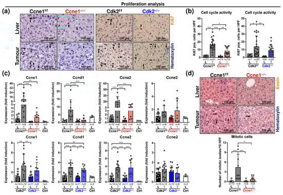 Cyclins are oscillatory expressed during different phases of the cell cycle to modulate catalytically active CDKs in specific complexes. E-type cyclins (CCNE1, CCNE2), together with Cyclin-dependent kinase 2 (CDK2), were described to regulate transition from the Gap1 (G1)-phase of the cell cycle into DNA-synthesis (S-phase). Additionally, CDK2 together with Cyclin A triggers S-phase progression [6]. Recently, we demonstrated that Ccne1 is a suitable therapeutic target for the treatment of liver fibrosis [7]. In addition, Ccne1 and Cdk2, but not Ccne2, are essential for HCC initiation in vivo. We and others provided evidence for substantial roles of E-type Cyclins during HCC progression, which are associated with impaired overall patient survival and a specific genetic signature characteristic of high replication stress and strong DNA repair response—potentially promoting genetic instability [2,8,9,10]. Several studies indicated that deregulated gene expression, structural variants and aberrant degradation signalling shape the oncogenic functions of CCNE1, which appear to be at least partially CDK2-independent [9,10,11]. In fact, the individual contributions of CCNE1 and CDK2 for the progression of HCC in vivo and their relevance as diagnostic and prognostic biomarkers or therapeutic targets in patients have not been addressed in detail so far.