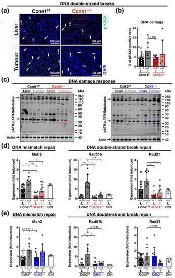 Aberrant hepatic CCNE1 expression induces DNA damage due to replication stress and oxidative stress, which promotes double-strand breaks (DSB), chromosomal instability and selective hepatocyte transformation in mice [2,8,10]. Hence, we investigated the influence of interventional Ccne1 or Cdk2 depletion in HCC on markers of DNA damage and repair during HCC progression. Phosphorylation of histone H2AX (pH2AX), a marker for DSB, in dissected tumours and corresponding liver tissues was not significantly different between Ccne1f/f and Ccne1−/− mice at week 40 after DEN (Figure 3a,b).