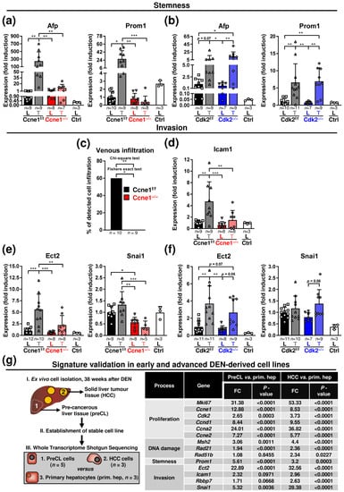 HCC progression after interventional deletion of Ccne1 is characterised by diminished stemness and microinvasion. Two-week-old Mx-Cre transgenic mice with floxed Ccne1 or Cdk2 alleles were treated with DEN. After tumour initiation, mice were repetitively injected with pIpC at week 22 to induce the deletion of Ccne1 or Cdk2 (Ccne1−/−, Cdk2−/−). Mx-Cre-negative mice also received both DEN and pIpC and served as wildtype controls (Ccne1f/f, Cdk2f/f). HCC progression was analysed after week 40. Details are given in Figure 1 and in the method section. L: liver; T: tumour tissue. (a,b) Gene expression analysis of alpha fetoprotein (Afp) and Prominin 1 (Prom1) in (a) CcnE1f/f and CcnE1−/− or (b) Cdk2f/f and Cdk2−/− animals. Ctrl: livers of untreated wildtype mice. Normalised expression levels were calculated as fold induction in comparison to DEN-treated control livers. Data are expressed as mean ± SD. (c) Incidence (%) of venous infiltration (microinvasion, V1) in CcnE1f/f and CcnE1−/− mice. H&E sections (not shown) were analysed for presence of hepatoma cells in venous vessels by an experienced pathologist (N.G., see Supplementary Table S1). (d) Gene expression analysis of Intracellular adhesion molecule 1 (Icam1) in CcnE1f/f and CcnE1−/−. (e,f) Epithelial cell transforming sequence 2 (Ect2) and snail family transcriptional repressor 1 (Snai1) in (e) CcnE1f/f and CcnE1−/− or (f) Cdk2f/f and Cdk2−/− animals. Ctrl: livers of untreated wildtype mice. Normalised expression levels were calculated as fold induction in comparison to DEN-treated control livers. Corresponding signalling pathways of the target genes are indicated in the headings. Sample sizes are indicated within diagrams. Data are expressed as mean ± SD. *: p < 0.05; **: p < 0.005; ***: p < 0.001. (g) In vitro validation of gene expression signature in early and advanced murine DEN-derived hepatoma cell lines (GEO database, accession no. GSE111079, accessed on 22 October 2021). Left: schematic illustration of sample generation. (I.) Primary murine hepatoma cells were ex vivo isolated from solid tumours (1) or surrounding liver (2) tissues of DEN-treated, Cre-negative C57B6 animals with a floxed allele of Ccne1 or Cdk2 at the age of 40 weeks and (II.) cultured to obtain stable cell lines. (III.) Gene expression levels of tumour-derived advanced HCC cells (1. HCC, n = 3) or precancerous liver cells (2. preCL, n = 5) were compared to non-transformed primary isolated hepatocytes (3. prim. Hep, n = 3) by Whole Transcriptome Shotgun Sequencing. Right: table of gene expression levels of preCL and HCC cells as fold change (FC) to primary hepatocytes for markers of proliferation (Mki67, Ccne1, Cdk2, Ccnd1, Ccna2 and Ccne2), stemness (Prom1), DDR (Msh2 Rad21 and Rad51b) and invasion (Ect2, Rbbp7, Icam1 and Snai1). p-values are indicated for each gene.