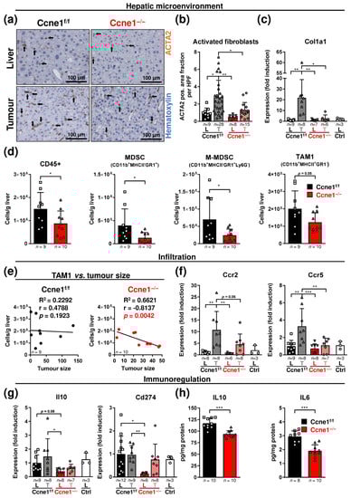 Interventional deletion of Ccne1 is associated with reduced presence of activated myofibroblasts and myeloid cells during HCC progression. Two-week-old Mx-Cre transgenic mice with floxed Ccne1 allele were treated with DEN. After tumour initiation, mice were repetitively injected with pIpC at week 22 to induce the deletion of Ccne1 (Ccne1−/−). Mx-Cre-negative mice also received both DEN and pIpC and served as wildtype controls (Ccne1f/f). HCC progression was analysed after week 40. Details are given in Figure 1 and in the method section. L: liver; T: tumour tissue. (a) Immunohistochemical smooth muscle actin alpha 2 (ACTA2) staining (brown) of paraffin sections in tumour-free liver and tumorous tissues. Total nuclei were stained with hematoxylin (blue). Arrows indicate ACTA2-positive cells. (b) Quantification of ACTA2-positive area fraction at a magnification of 200×. HPF: High power field. (c) Gene expression analysis of collagen type I alpha-1 chain (Col1a1). Ctrl: livers of untreated wildtype mice. Normalised expression levels were calculated as fold induction in comparison to DEN-treated control livers. (d) Determination of immune cell populations according to surface marker expression, cluster of differentiation 45 (CD45)-positive cells, myeloid-derived suppressor cells (MDSC), monocytic MDSCs (M-MDSC), granulocytic MDSCs (G-MDSC), tumour-associated macrophages 1 (TAM1), as cells per gram liver by cytometry. The gating strategy is shown in Figure S2a and described in the method section. Data are expressed as mean ± SD. (e) Linear analysis. Correlation between the cumulative tumour size and amount of TAM1. R2: Coefficient of determination, r: Pearson correlation coefficient, p-values are indicated within diagrams. (f,g) Gene expression analysis of (f) CC chemokine receptor 2 (Ccr2), CC chemokine receptor 5 (Ccr5), (g) interleukin 10 (Il10) and cluster of differentiation 274 (Cd274). Ctrl: livers of untreated wildtype mice. Normalised expression levels were calculated as fold induction in comparison to DEN-treated control livers. (h) Determination of IL10 and interleukin 6 (IL6) concentrations in DEN-treated livers by ELISA. Corresponding signalling pathways of the target genes are indicated in the headings. Sample sizes are indicated within diagrams. Data are expressed as mean ± SD. *: p < 0.05; **: p < 0.005; ***: p < 0.001.