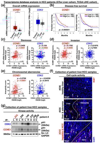 The CCNE1 but not the CDK2 level contributes to a gene signature of dedifferentiation, invasion and chromosomal instability. In silico database analysis of CCNE1 and CDK2 expression in tumour samples and matching tumour-free liver samples of HCC patients based on RNA-seq data generated by the TCGA Research Network, liver hepatocellular carcinoma (LIHC) cohort (http://cancergenome.nih.gov/, n = 373 HCC samples, n = 50 liver samples, accessed on 5 May 2021) and independent tumour-free liver samples (n = 110) by GTex liver cohort (http://gtexportal.org/, accessed on 5 May 2021). Details are given in the methods section. (a) mRNA expression levels of CCNE1 (left) and CDK2 (right) in HCC patients and healthy livers (according to http://gepia2.cancer-pku.cn/, accessed on 5 May 2021). TPM: Transcript per kilobase million. ***: p < 0.001. (b) Disease-free survival of HCC patient cohorts (according to http://gepia2.cancer-pku.cn/, accessed on 5 May 2021) with high or low expression of CCNE1 (left) or CDK2 (right). (c–e) Linear analysis in human HCC patients. (c) Correlation between mRNA expression levels of CCNE1 (left) or CDK2 (right) and AFP mRNA expression. (d) Correlation between mRNA expression levels of CCNE1 (left) or CDK2 (right) and ICAM1 mRNA expression. (e) Correlation between mRNA expression levels of CCNE1 (left) or CDK2 (right) and aneuploidy score (sum of altered chromosome arms). Corresponding signalling pathways of the target genes are indicated in the headings. ρ: Spearman correlation coefficient, p-values and sample sizes are indicated within diagrams. RSEM: RNA-Seq by Expectation–Maximisation. (f,g) Analysis of a small cohort of human hepatocellular carcinoma samples (H) and matching surrounding liver (L) tissues (#243, 250, 140), adenomas (A, #235, 246) and healthy control liver (C, #236). Patient details are given in Figure S6. (f) Immunofluorescence staining of Ki67 (red) in liver cryosections of selected patients displaying healthy control liver (#236), benign liver adenoma (#235) or HCC (#243). Dashed lines highlight the border between tumorous and non-tumorous tissue. Total nuclei were stained with DAPI (blue). Arrows indicate Ki67-positive cells. (g) In vitro kinase assay from human liver and HCC samples after immunoprecipitation (IP) of CDK2 or CCNE1. Arrow: phosphorylation of the substrate histone H1 (pH1). GAPDH expression served as input control. Red: proliferative HCC sample lacking CDK2 kinase activity.