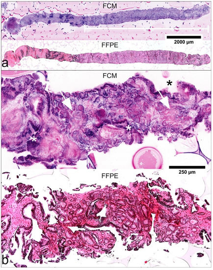 After the scan was made, the tissue was immediately placed into labelled embedding capsules and fixed in 4% PBS-buffered formaldehyde for 24 h. The further histological investigation was carried out immediately for all biopsies following the standard procedure for formalin-fixed and paraffin embedded (FFPE) tissue. The biopsies were not removed from the foam pads during further processing in order not to change their orientation. In this way, the FCM scan could be directly compared with the histological slides of the same tissue. Minor differences in the structures shown in the figures at higher magnifications result from the different penetration depths of the compared methods (FCM: 30–100 µm vs. up to 16 serial sections in conventional histology resulting in penetrations depths of 1000 µm and more).
