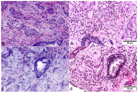 FCM images were also well suited for the classification of benign and preneoplastic lesions. In two of the biopsies, small foci of high-grade prostatic intraepithelial neoplasia (HgPIN) were detectable using conventional histology and immunohistology. In the FCM scans (Figure 4c,d) these lesions presented as organoid glands with hyperplastic epithelial lining. Some of the luminal epithelia showed enlarged nuclei with prominent nucleoli. These foci were intraoperatively (UT) rated as normal (0) and as suspect atypical glands (1) in the post hoc examination (BT).