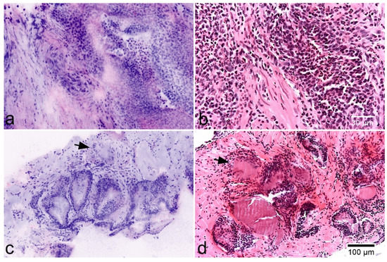 Inflammatory lesions of the prostate. (a,b) Acute prostatitis in FCM scans (left) and HE-morphology. Note a dense granulocytic infiltrate in the stroma and epithelium. (c,d) Non-specific granulomatous prostatitis showing enlarged glands and a periglandular inflammatory infiltrate of lymphocytes and giant cells (arrows).