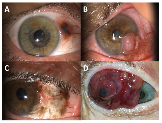 Clinical aspect of conjunctival melanoma (CM) upon presentation or after recurrence: (A) CM arising from a naevus; (B) Recurrence of achromic CM with primary acquired melanosis (PAM) (first surgery performed in another area without “no-touch” surgery); (C) Extended multifocal CM arising from PAM; (D) Early and massive recurrence of CM despite wide local excision followed by proton beam radiotherapy. The patient underwent orbital exenteration and died from metastatic spread of his CM thereafter.