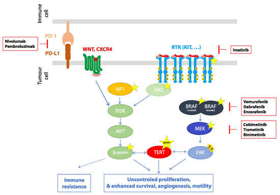 - not all CMs are targetable by BRAF and MEK inhibitors. Preliminary data indicate that NRAS-mutated CMs are relatively resistant to targeted therapies [114]. Therefore, only CM carrying a BRAF mutation can be treated with MAPK inhibitors;