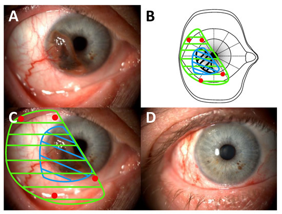 - Finger, P.T.; Jain, P.; Mukkamala, S.K. Super-Thick Amniotic Membrane Graft for Ocular Surface Reconstruction. Am. J. Ophthalmol. 2019, 198, 45–53. [Google Scholar] [CrossRef]