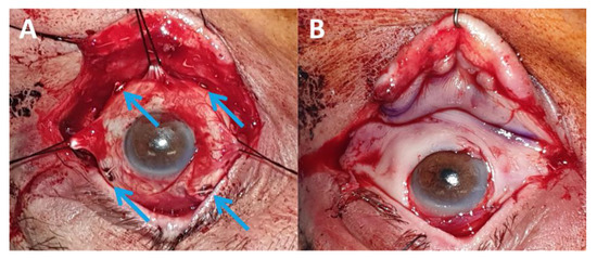 Figure 5. Removal of a conjunctival melanoma invading the inferior fornix. (A) Inferolateral cantholysis was performed to achieve adequate surgical exposure. The oculomotor muscles were dissected and hooked. Tumour removal involved 300° of the bulbar conjunctiva, the inferior conjunctival fornix and the posterior eyelid lamella (the anterior lamella and the tarsus were preserved). Four tantalum clips (blue arrows) were sutured to guide subsequent proton beam therapy; (B) Reconstruction of the entire defect with a buccal membrane graft with reconstruction of the lower fornix.
