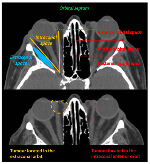 An intraorbital involvement is defined by a tumour spread located behind the orbital septum (Figure 7). Compared to locally advanced basal cell carcinoma (BCC), only malignancies invading the anterior and extraconal orbital spaces can be treated conservatively (Figure 7) [106,107]. Removal of more posterior and/or intraconal malignancies is associated with major surgical difficulties and subsequent iatrogenic damage [96]. In addition, the data on BCC cannot be strictly extrapolated to CM because adjuvant radiotherapy is rarely required in BCC [104,105]. In the case of CM invading the anterior orbit, adjuvant radiotherapy would be indicated despite complete surgical excision, due to its invasive and infiltrative nature. To date, data on conservative surgeries followed by adjuvant radiotherapy for CM invading the orbit are lacking.