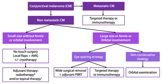 As shown in Table 1, the ideal adjuvant therapy is debated and no standard of care has been proposed. Adjuvant therapy mainly depends on the local ocular oncology centre practice. Many authors recommend performing intraoperative cryotherapy at the surgical margins, while others have abandoned this technique and prefer to use adjuvant topical chemotherapy, brachytherapy or PBRT [5,45,51,62,63,64,65,66]. CM is a rare tumour and no studies have compared the different adjuvant treatments. Another major concern is the time interval between the initial surgery and the administration of adjuvant treatment. It has been shown that the longer the time interval, the higher the risk of local recurrence [67,68]. Several factors should be taken into account, such as the tumour origin (i.e., PAM versus naevus), location (i.e., bulbar versus tarsal) and extent, and the associated histologic prognostic factors.