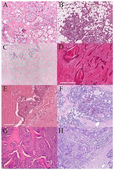 - Foschini, M.P.; Morandi, L.; Asioli, S.; Giove, G.; Corradini, A.G.; Eusebi, V. The morphological spectrum of salivary gland type tumours of the breast. Pathology 2017, 49, 215–227. [Google Scholar] [CrossRef] [PubMed]