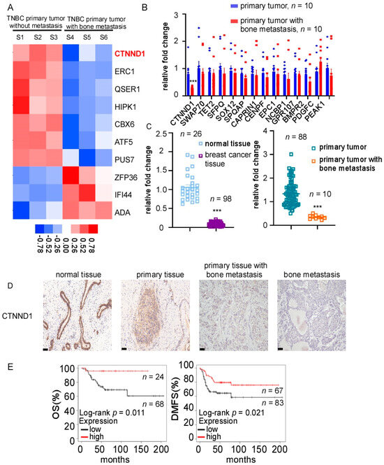To investigate the molecular profile of metastatic bone lesions derived from TNBC, high-throughput sequencing was performed in cohort 1, which included metastatic bone lesions from three patients who had only bone metastases and three early TNBC patients without any signs of distant metastasis. The top ten differentially expressed genes were shown in the heatmap (Figure 1A). Fourteen bone-metastasis-related genes in the top 100 differentially expressed genes were selected and quantified in cohort 2, which included ten TNBC patients with only bone-metastasis and ten early TNBC patients. Compared with early TNBC, CTNND1 was significantly downregulated in primary tumors of TNBC patients within the bone-metastasis subgroup (Figure 1B). We further quantified the expression level of fresh-frozen samples in cohort 3 and found that CTNND1 was decreased in TNBC tissues compared with normal tissues, and further decreased in primary TNBC tissues with bone metastasis (Figure 1C). We further detected the protein level of CTNND1 through IHC staining and found that the CTNND1 protein expression level was in interesting descending order with the highest seen in normal breast tissues, followed by in primary TNBC tissues without metastasis, then in TNBC primary tissues with bone-metastasis, with the lowest seen in metastatic bone tissues (Figure 1D). Clinical data from TCGA were analyzed which revealed that TNBC patients with lower CTNND1 expression had shorter disease-free survival (DFS) (p = 0.011) and shorter disease metastasis-free survival (DMFS) (p = 0.021) (Figure 1E). However, the expression of CTNND1 had no prominent influence on either OS or DMFS in other types of breast cancer (Figure A1A).