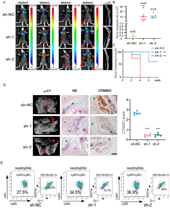 3.2. Decreased CTNND1 Promotes TNBC Bone Metastasis and Neutrophils Infiltration in Bone