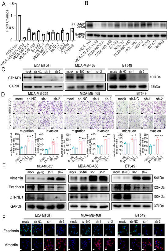 Downregulation of CTNND1 enhances EMT in TNBC cells. (A) CTNND1 expression level in human normal breast epithelial cells (MCF-10A) and various breast cancer cells (MDA-MB-231-1833, MDA-MB-231, MDA-MB-468, BT549, Hs578T, MDA-MB-453, HCC1937, MCF-7, T47D, BT474, SKBR3) by qRT-PCR. (B) Immunoblotting of the protein encoded by CTNND1 in human breast normal cell and breast cancer cells as the same as cell lines detected by qRT-PCR. (C) Immunoblotting of verifying knocking down CTNND1 stably in human TNBC cell lines (MDA-MB-231, MDA-MB-468, BT549). (D) Images and quantification of transwell migrated and invaded cells after CTNND1 knockdown. Scale bar represents 200 μm. (E) Immunoblotting of EMT markers in cells with CTNND1 knockdown or not. (F) Immunofluorescence of EMT markers in cells with CTNND1 knockdown or not. Scale bar represents 50 μm. All experiments were repeated at least 3 times. * p < 0.05, ** p < 0.01, *** p < 0.005. Error bars indicate Standard Error of Mean (S.E.M.). Please see the supplementary file for the original western blots used to assemble the figures.