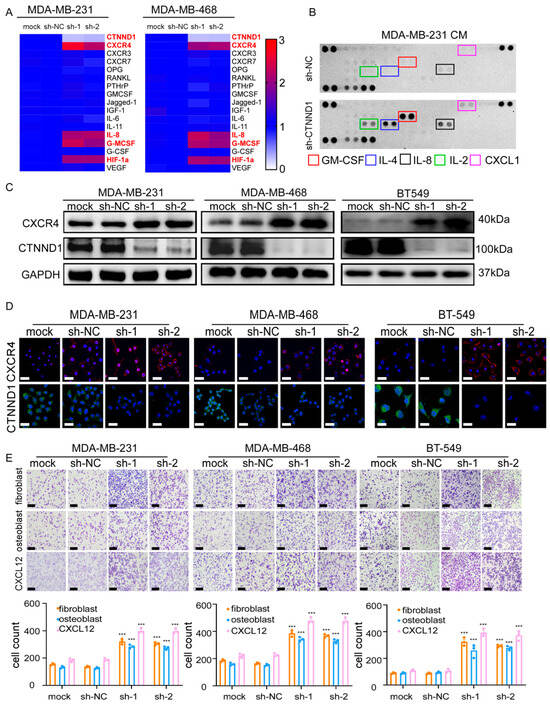 Since decreased CTNND1 promoted the intrinsic malignancy of breast cancer cells and correlated more frequently with bone metastasis in breast cancer patients, we next explored whether CTNND1 plays a role in bone metastasis of breast cancer. We firstly detected the expression of bone metastasis related genes by real-time PCR and found that downregulation of CTNND1 significantly upregulated CXCR4, GM-CSF, IL-8 and HIF-1α in both MDA-MB-231 and MDA-MB-468 cell lines (Figure 4A). We then compared the difference of cytokines secreted in the conditioned medium (CM) of MDA-MB-231 transduced with sh-NC orsh-CTNND1 and found that the expression levels of GM-CSF, IL-8, IL-4, IL-2 and CXCL1 were higher in CM of cells with reduced CTNND1 than that of control cells (Figure 4B). In TNBC cell lines, we further validated that knockdown of CTNND1 upregulated CXCR4 (Figure 4C,D). To avoid the off-target effect of siRNA, we performed RNAi-resistant experiments and confirmed that CTNND1 regulated CXCR4 (Figure A2A,C). As the CXCR4/CXCL12 axis was well known for chemotaxis of tumor cells in bone metastasis [24,25], we co-cultured TNBC cell lines with reduced CTNND1 together with fibroblasts, osteoblasts and CXCL12 cytokine, respectively, as CXCL12 was mainly produced by fibroblasts and osteoblasts in bone. Indeed, knockdown of CTNND1 accelerated TNBC cells migration through upregulation of the CXCR4/CXCL12 axis (Figure 4E and Figure A2B,E).