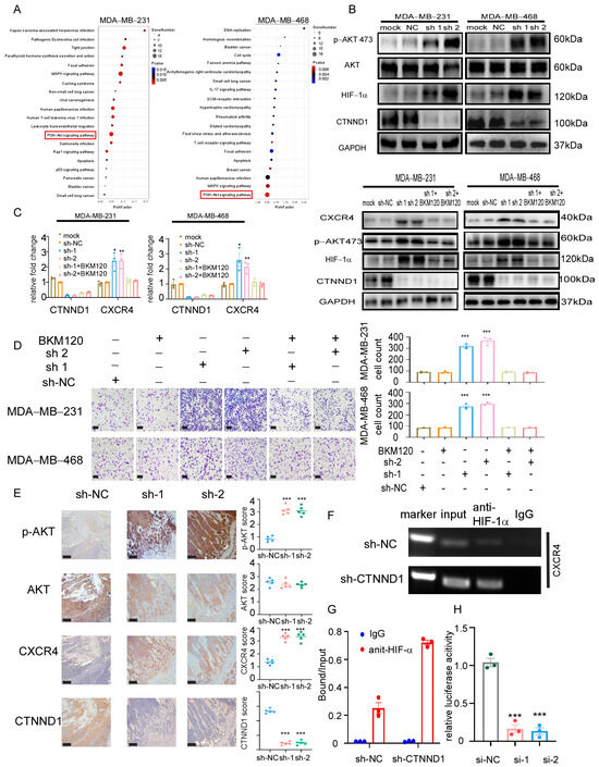 To elucidate the underlying mechanisms by which knockdown CTNND1 upregulated CXCR4, we performed transcriptome sequencing analysis in MDA-MB-231 and MDA-MB-468 cells with CTNND1 knockdown cells. Combined with Kyoto Encyclopedia of Genes and Genomes (KEGG) database pathway analyses, PI3K/AKT pathway was found to be activated in both cancer cell lines when their CTNND1 were knocked down (Figure 5A). We next screened the differentially expressed genes (compared with the control cells) and then overlapped with the previously reported bone metastasis-related genes that correlated with PI3K/AKT pathway. We found that knockdown of CTNND1 activated the PI3K/AKT pathway and also upregulated HIF-1α (Figure 5B). To verify the activation of the PI3K/AKT pathway in vivo experiments, we examined its activation via IHC staining in the bone of mice bearing tumor with CTNND1 knockdown (Figure 5E). The mRNA of CXCR4 was prominently upregulated in cancer cells with CTNND1 knockdown, suggesting that it might be regulated at the transcription level. We further demonstrated that the PI3K inhibitor BKM120 and LY294002 were able to abolish the upregulation of CXCR4 and HIF-1α seen in cells with CTNND1 knockdown (Figure 5C and Figure A3C,D). Moreover, the PI3K/AKT inhibitors strongly suppressed chemotaxis of TNBC cells, likely due to the concurrent inhibition of the CXCR4/CXCL12 axis (Figure 5D). HIF-1α chromatin immunoprecipitation (ChIP), followed by quantitative PCR (qPCR), demonstrated that knockdown of CTNND1 enhanced the binding of HIF-1α to the CXCR4 transcription start site in MDA-MB-231 cells (Figure 5F,G and Figure A3E). Knockdown of HIF-1α prominently abolished luciferase activity in MDA-MB-231 transfected with CXCR4 promoter construct (Figure 5H).