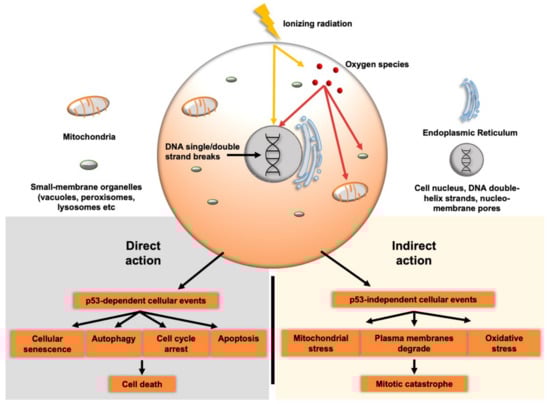 Cellular effects of ionizing radiation. Ionizing radiation directly damages DNA within targeted cells, causing both single and double strand DNA strand damage. Oxygen species are also created that cause DNA damage and disrupt lipid membrane components of the cell. Both the direct and indirect actions of radiation therapy cause downstream effects that lead to mitotic catastrophe and cell death.