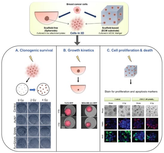 Another useful method of analysis is the non-destructive assessment of tissue growth kinetics in scaffold-free, spheroid-based models [107]. Anastasov et al. evaluated 3D microtissue growth by calculating tissue area in breast cancer spheroids of T47D and MDA-MB-361 in response to different radiation doses (2–8 Gy) [107,108] (Figure 2B). This enabled the comparison of radiation sensitivity of the two cell types and the method was also used for studying the radiosensitizing effects of established chemotherapeutic drugs [107]. As one would expect, radiation has been predominantly studied with an aim for causing cellular death or cell cycle arrest. Consequently, markers for cellular proliferation, cell death and DNA damage have been widely studied in radiation experiments. Ahmed et al. had used TUNEL staining and Ki-67 staining to detect apoptosis and proliferation respectively in irradiated T4-2 cells in 3D lrECM cultures [89] (Figure 2C). γH2AX a well-known marker of DNA double stranded breaks which is induced by irradiation. It has been used for assessing DNA damage post irradiation in several radiation biology studies [135]. Yet, it has not been explored as widely in in vitro 3D breast cancer radiobiology studies. In addition to the assessment of growth and proliferation, studying radiation induced changes in gene and protein expression has helped to understand the cellular mechanisms of radiation response. A radiation dose of 2 Gy was shown to cause an upregulation of surface expression of integrin in 3D lrECM cultures of malignant breast cancer cells, which was measured by both immunoblotting and immunofluorescent staining [90].
