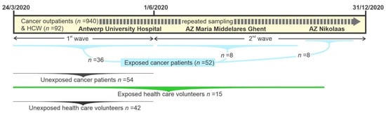 Ambulatory cancer patients that were scheduled for routine blood sampling attending the Multidisciplinary Oncology Unit of Antwerp University Hospital (MOCA) between 24 March 2020 and 31 May 2020, and the Oncology Unit of AZ Maria Middelares Hospital, Ghent, between 13 April 2020 and 31 May 2020, and consenting to participate (n = 922), were studied prospectively as part of the first COVID-19 pandemic wave in Belgium [26]. In addition, health care workers (HCWs; n = 92) from these units donated similar blood samples during the study period at time points 0, 1, 2, and 3 months after written informed consent. Active SARS-CoV-2 infection was diagnosed via detection of viral RNA in nose/throat swabs using the Cobas SARS-CoV-2 RT-PCR (Roche) on the automated Cobas 6800 system. Anti-SARS-CoV-2 immunoglobins (Ig) in blood were tested using three commercial tests, namely, Liaison SARS-CoV-2 S1/S2 IgG (DiaSorin, Saluggia, Italy), Alinity SARS-CoV-2 IgG (Abbott, Chicago, IL, USA), and Elecsys Anti-SARS-CoV-2 (Roche, Basel, Switzerland), as described [26].