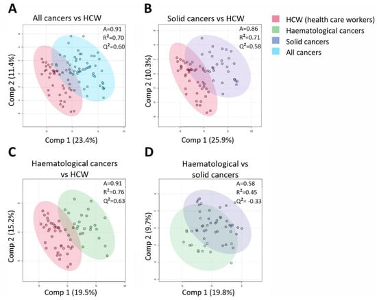 We analysed plasma samples of unexposed cancer patients with either solid or haematological malignancies as well as unexposed HCWs for 55 CCGs (Figure 2). Partial least squares discriminant analysis (PLS-DA) identified a clear clustering of the HCWs and combined group of cancer patients (accuracy = 91%, R2 = 0.76, Q2 = 0.63 for 2 components; Figure 2A). High classification accuracies were also achieved between the unexposed HCW group and unexposed solid tumours (accuracy = 86%, R2 = 0.71, Q2 = 0.58; Figure 2B) and between the unexposed HCWs and haematological malignancies (Accuracy 91%, R2 = 0.76, Q2 = 0.63; Figure 2C). However, we did not find a clear clustering of the CCG profiles between haematological and solid malignancies (Q2 = −0.33 for 2 components; Figure 2D). Further analysing the individual cytokine differences between solid and haematological malignancies with a one-way analysis of variance (ANOVA), we found a statistically significant increase in only 3 CCGs in patients with solid tumours compared to those with haematological malignancies: BDNF (4.1-fold, p = 0.004), VEGF-C (2.2-fold, p = 0.019), and SAA (2.2-fold, p = 0.016). These data suggest that while the baseline CCG profiles in unexposed patients with solid or haematological malignancies are significantly different from the unexposed HCWs, CCG profiles of unexposed patients with either solid or haematological malignancies are not grossly distinct.