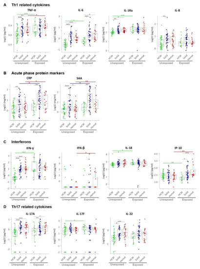 Plasma levels of pro-inflammatory CCGs as (A) Th1 related cytokines, (B) acute phase proteins, (C) interferons and interferon-related cytokines, and (D) Th17 related cytokines. HCW, health care workers (green); solid, patients with solid tumours (blue); hemat, patients with haematological malignancies (red). Each dot represents the sample closest to exposure in the case of exposed patients, and an average of multiple timepoints, when available, for unexposed patients. * p < 0.05, ** p < 0.01, *** p < 0.001.
