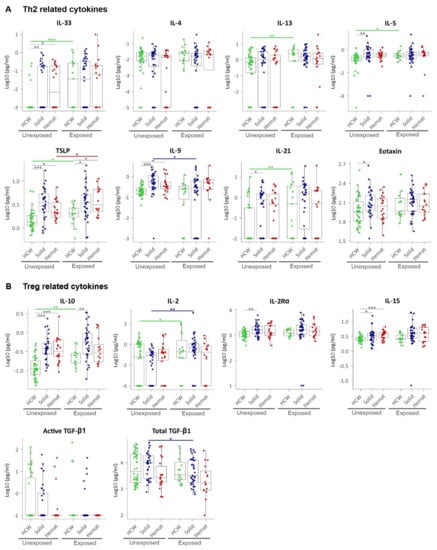 Plasma levels of (A) Th2 related (anti-inflammatory) cytokines and (B) Treg-related (immunomodulatory) cytokines. HCW, health care workers (green); solid, patients with solid tumours (blue); hemat, patients with haematological malignancies (red). Each dot represents the sample closest to exposure in the case of exposed patients, and an average of multiple timepoints, when available, for unexposed patients. * p < 0.05, ** p < 0.01, *** p < 0.001.