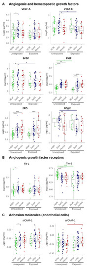 Plasma levels of (A) angiogenic and haematopoietic growth factors, (B) angiogenic growth factor receptors, and (C) adhesion molecules expressed by endothelial cells. HCW, health care workers (green); solid, patients with solid tumours (blue); hemat, patients with haematological malignancies (red). Each dot represents the sample closest to exposure in the case of exposed patients and an average of multiple timepoints, when available, for unexposed patients. * p < 0.05, ** p < 0.01, *** p < 0.001.