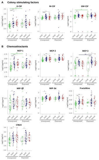Plasma levels of (A) colony stimulating factors (CSFs) and (B) monocyte chemoattracting proteins (MCPs), macrophage inflammatory proteins (MIPs) and other chemokines. HCW, health care workers (green); solid, patients with solid tumours (blue); hemat, patients with haematological malignancies (red). Each dot represents the sample closest to exposure in the case of exposed patients and an average of multiple timepoints, when available, for unexposed patients. * p < 0.05, ** p < 0.01, *** p < 0.001.