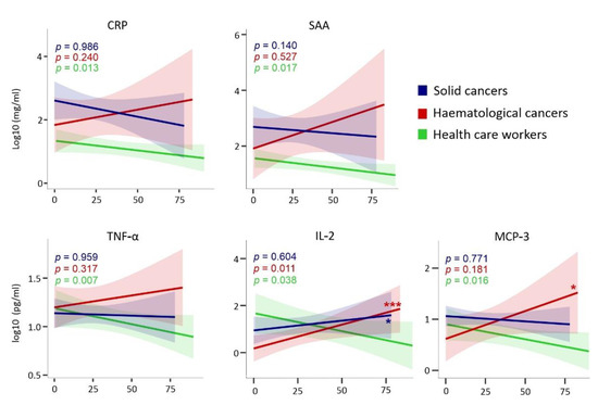We first showed that the inflammatory mediators CRP and SAA significantly declined in HCWs after SARS-CoV-2 exposure. A non-significant declining trend was also observed for solid tumours, but not for the haematological malignancy group suggesting a persistence of pro-inflammatory state in cancer patients, especially haematological malignancy patients, exposed to SARS-CoV-2 (Figure 7). A persistence of CCGs such as TNF-α, IL-2, and MCP-3 was also observed for exposed cancer patients but not for the healthy control group. For the haematological malignancy patient group, levels of IL-2 and MCP-3 even temporarily increased in the three-month follow-up and was significantly different from the declining levels noted for healthy controls. A significant temporal increase in IP-10 was also observed for haematological malignancy patients compared to a non-significant declining trend for healthy controls. These data suggest that several CCGs shown to be significantly increased in the exposed cancer patients compared to unexposed cancer patients are in fact long-lasting changes that could persist for at least 3 months after SARS-CoV-2 exposure.
