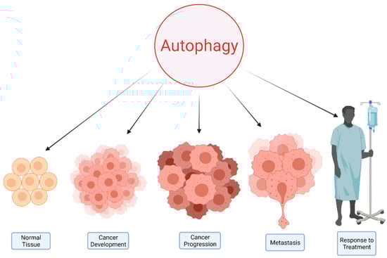 Autophagy plays a prominent role in maintaining cellular homeostasis through the removal of damaged organelles, abnormal proteins, and invading organisms. Defects in autophagy are associated with various pathological conditions, including cancer [5]. It can lead to accumulation of damaged mitochondria and alter cellular metabolism, leading to a high oxidative state [6]. Furthermore, impairments in autophagy flux can lead to ER stress and subsequent accumulation of chaperone proteins and an eventual rise in the unfolded protein burden [7,8]. This chronic injury to various cellular organelles and proteins and the accumulation of the genetic damage in cells with defective autophagy can lead to the development of pathophysiologies, as evidenced by the detection of loss-of-function mutations in different autophagy genes in various malignancies such as colorectal cancer [9]. However, despite this significant role of autophagy in the initiation of tumors, it is a double-edged sword in cancer, and its role is highly context dependent [10]. Cancer cells are dependent on the cellular autophagy machinery due to their rapid growth and biosynthetic demands [6,8]. Autophagy also plays a significant role in promoting metastasis in certain tumors, particularly in RAS-driven cancers [11]. Conversely, autophagy can also be leveraged to enhance the response to various cancer treatments [12] (Figure 1).