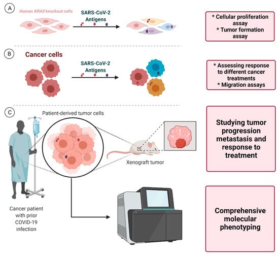 Proposed framework for laboratory-based investigations. (A) Investigations that could unravel the potential effects of various SARS-CoV-2 antigens on cellular proliferation and tumor formation in human KRAS knockout cells. (B) Using patient-derived cancer cells, the effect of these antigens and the subsequent autophagy blockade and MHC-I downregulation on response to different cancer treatments and metastasis (migration assays) could be studied. (C) Furthermore, studying tumor specimens arising in the presence of SARS-CoV-2 antigens using xenograft mouse models and also advanced molecular phenotyping techniques could unravel tumor biological behavior (growth rate, metastasis, etc.), its molecular characteristics, and the underlying factors affecting its response to various cancer therapeutics.