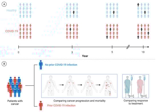 Proposed framework for clinical and population-based investigations. (A) Studies that can investigate whether prior COVID-19 infection is a risk factor for development of malignancies in subsequent years. (B) Other investigations could also shed light on the potential long-term effects of SARS-CoV-2 antigens present in cancer tissues on cancer progression and mortality rate and the response to different cancer therapeutics. The back icon in (A) represents a patient with a new diagnosis of cancer. Please note that the numbers of individuals with cancer in both groups have been arbitrarily chosen and are not based on real-life data. Future investigations will hopefully examine the hypothesis described here.