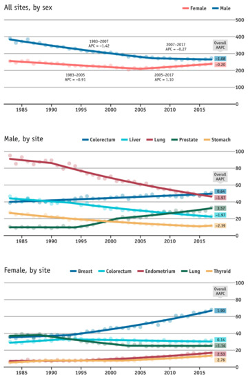 Figure 1 shows the age-standardised incidence rate for all cancer sites combined, which are the male and female cancers in Hong Kong from 1983 to 2017. In 2017, the age-standardised rate of cancer overall was 258.0 per 100,000 people (272.5 for men and 240.8 for women) in Hong Kong, down from 313.1 per 100,000 people (390.1 for men and 254.5 for women) in 1983. The AAPC was observed to be −0.60% overall (−1.10% for men and −0.20% for women), which is an indication of decreasing overall disease risks with more noticeable decline among men in Hong Kong in past three decades. However, compared to the earlier years, there was an increasing trend for all sites combined for female cancers overall between 2005 and 2017 (APC = 1.1%), and a decreasing trend for all sites combined for male cancers overall between 2007 and 2017 (APC = −0.3%).