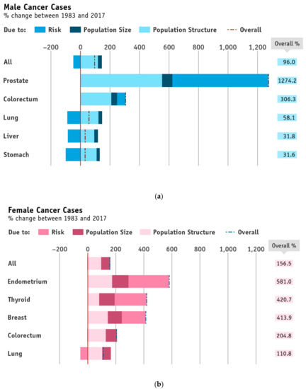 While the demographic component of cancer burden change is mostly associated with population ageing and population growth, the disease in the risk component would likely be associated with extended cancer screening, as in the case of breast cancer [17], prostate cancer [18], colorectal cancer, and improvements in diagnosis, as in the case of thyroid cancer [19]; declines in cancer incidence rates related to vaccination programmes, as in the case of hepatitis B vaccination and liver cancer [20]; reduction in smoking prevalence in the case of lung cancer [21]; and screening and eradication therapy of Helicobacter pylori infections as well as improvements in the food preservation and storage, in the case of stomach cancer [22,23,24]. Well-established associations would also explain change in disease risks. For instance, for breast cancer, unhealthy lifestyles and reproductive risk factors, such as women having fewer children at an older age, could contribute to the increase [25]. For endometrial cancer, increases in incidence may mainly occur as a consequence of rising obesity prevalence [26,27]. We therefore suggest primary prevention and early cancer detection as ways to combat the trends.