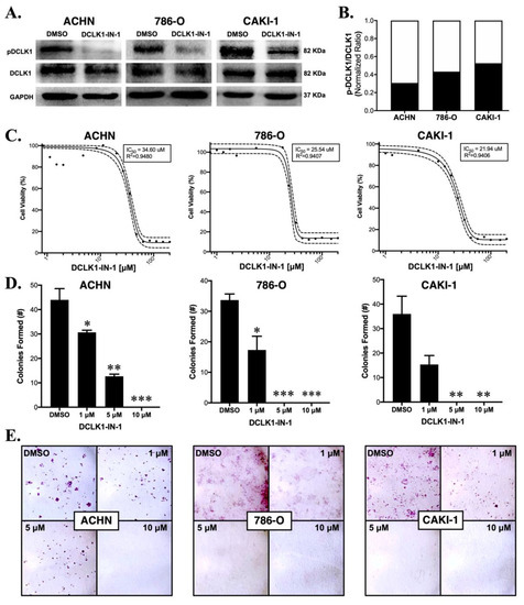 DCLK1-IN-1 inhibits DCLK1 phosphorylation and colony formation in RCC cell lines. (A) Immunoblots demonstrating a strong decrease in phosphorylation of DCLK1 serine 337 by DCLK1-IN-1 (10 µM) when added to serum-starved RCC cells together with FBS for their stimulation, with incubation at the indicated time periods: ACHN (48 h), 786-O (24 h), and CAKI-1 (48 h). (B) Western blot band densitometry of phospho-DCLK1 normalized to total DCLK1 after DCLK1-IN-1 treatment (black bar) relative to dimethylsulfoxide (DMSO) vehicle control (white bar) in the ACHN, 786-O, and CAKI-1 RCC cell lines. (C) MTT cell viability assay results and IC50 curves for ACHN (48 h), 786-O (48 h), and CAKI-1 (72 h) RCC cells, demonstrating a lack of notable cytotoxic/anti-proliferative effects at concentrations ranging up to 10 µM. (D) Quantification of the mean number of colonies formed after 10 days following a single dose of DCLK1-IN-1 (1, 5, or 10 µM) or DMSO vehicle control, demonstrating a significant reduction in clonogenic capacity after DCLK1-IN-1 treatment in ACHN, 786-O, and CAKI-1 RCC cells (* p < 0.05, ** p < 0.01, *** p < 0.001 vs. DMSO). (E) Representative figures of colony formation assays quantified in (D).