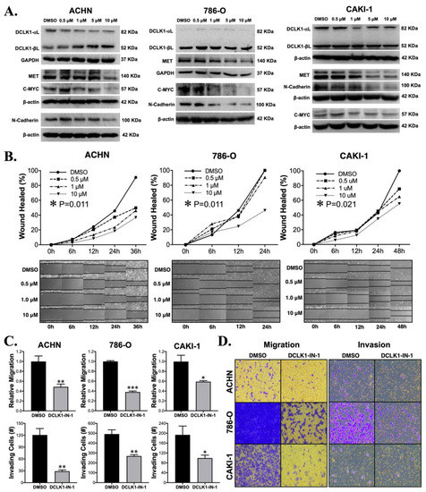 DCLK1-IN-1 treatment modulates DCLK1-associated pathway markers and inhibits RCC metastatic properties. (A) Immunoblot results for DCLK1 and known DCLK1-linked proteins in ACHN, 786-O, and CAKI-1 RCC cells, demonstrating no significant change in total DCLK1 (DCLK1-long-α + DCLK1-long-β) protein levels upon DCLK1-IN-1 incubation, whereas MET, C-MYC, and N-Cadherin were downregulated. (B) Wound healing assay results reveal a significant anti-migratory effect for DCLK1-IN-1 on ACHN, 786-O, and CAKI-1 RCC cells (images at 10× magnification). (C) Transwell migration and invasion assay results for DMSO or DCLK1-IN-1 treated ACHN, 786-O, and CAKI-1 RCC cells demonstrate potent anti-migratory and invasive effects for DCLK1-IN-1 (* p < 0.05, ** p < 0.01, and *** p < 0.001 vs. DMSO). (D) Representative images of migration and invasion of RCC cells in transwells quantified in (C) (10× magnification).