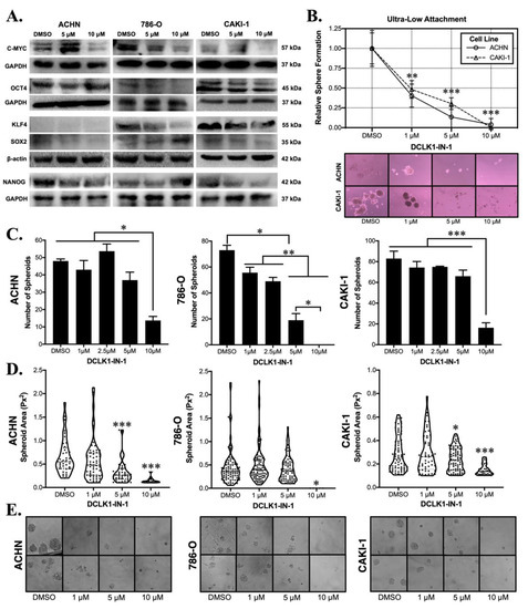 Western blotting for the expression markers of pluripotency demonstrated a trend towards reduced pluripotency after DCLK1-IN-1 treatment in all three RCC cell lines. In ACHN cells, DCLK1-IN-1 treatment caused decreases in c-MYC, NANOG, and SOX2 proteins. The 786-O cell line showed decreases in c-MYC, OCT4, and KLF4. Finally, the metastasis-derived CAKI-1 cell line showed decreased expressions of c-MYC, OCT4, NANOG, and SOX2 (Figure 3A). To assess the potential functional effect of DCLK1-IN-1 on CSC stemness, we performed ultra-low attachment and Matrigel spheroid assays using all three RCC cell lines. In ultra-low attachment assays, only ACHN and CAKI-1 cells were capable of forming spheroids and DCLK1-IN-1 treatment resulted in a significant reduction in the number of spheroids formed at 1, 5, and 10 μM concentrations (p < 0.01, Figure 3B). In Matrigel spheroid assays, treatment with DCLK1-IN-1 led to a marked reduction in the number of spheroids, with ACHN, 786-O, and CAKI-1 cell lines demonstrating reductions of approximately 70%, 100%, and 80%, respectively after 10 μM treatment (Figure 3C). Previous studies of RCC have demonstrated that DCLK1 activity is related to not only the number but also the size of spheroids formed [14,15]. Assessments of spheroid area using image analysis demonstrated dose-related decreases in all three cell lines (Figure 3D,E). Together, these findings demonstrate that DCLK1-IN-1 downregulates pluripotency factor expression and powerfully inhibits cancer cell stemness.