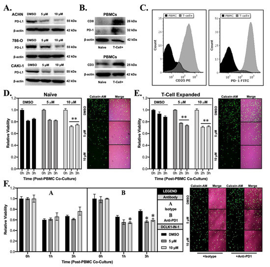 DCLK1-IN-1 downregulates immune checkpoint marker PD-L1 and enhances anti-tumor immunity in co-culture. (A) Immunoblotting from ACHN, 786-O, and CAKI-1 cells treated with DMSO or DCLK1-IN-1 demonstrating a dose-dependent decrease in the expression of tumor immune checkpoint ligand PD-L1. (B) Immunoblotting of proteins isolated from naïve and T-cell expanded PBMCs confirming increased expression of T-cell markers CD8, PD-1, and CD3. (C) Flow cytometry results for PBMCs and T-cell expanded PBMCs confirming successful T-cell expansion via strongly increased expression of membrane CD25 (manufacturer-recommended confirmation marker) and PD-1 (immune checkpoint marker). (D,E) 786-O was selected for co-culture assays based on its characteristically strong PD-L1 expression, pre-treated with vehicle (DMSO) or DCLK1-IN-1, counted by trypan blue exclusion, stained with Calcein-AM (green fluorescence), and seeded into co-culture with PBMCs or T-cell expanded PBMCs. Following, 3 h co-culture, 786-O cells demonstrated significant sensitivity to anti-tumor immunity from PBMCs after 10 µM pre-treatment with DCLK1-IN-1 (D) and from T-cell expanded PBMCs after 5 and 10 µM pre-treatment with DCLK1-IN-1 (E) (** p < 0.01 vs. DMSO at corresponding time; representative images included adjacent to graphs and merged with brightfield images; 10× magnification). (F) Co-culture assay of 786-O RCC cells pretreated with vehicle (DMSO) or DCLK1-IN-1 (5 or 10 µM), and PBMCs pre-treated with isotype antibody or anti-PD1, demonstrating a statistically significant effect on 786-O cell viability at 3 h for DCLK1-IN-1 pre-treated 786-O cells (* p < 0.05 vs. DMSO at corresponding time; 10× magnification).