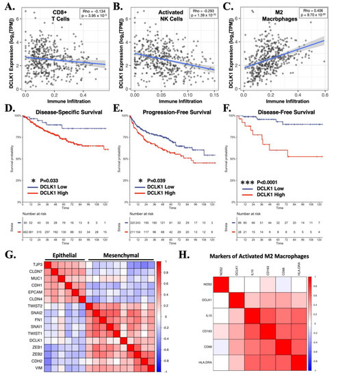DCLK1 is correlated with an immune excluded/desert phenotype characterized by reduced cytotoxic immune cells and increased M2 macrophages in the human RCC microenvironment. (A–C) Cibersort algorithm results from TCGA’s RCC dataset (n = 533), demonstrating a significant inverse association for DCLK1 with CD8+ cytotoxic T-cells (p < 0.0005, Spearman r = −0.134) (A) and activated NK cells (p < 0.0001, Spearman r = −0.293) (B), and a strong positive association with M2 macrophages (p < 0.0001, Spearman r = 0.406) (C). (D–F) Survival analysis based on DCLK1 expression from TCGA’s RCC dataset demonstrates significant association with reduced disease-specific ((D), p < 0.05), progression-free ((E), p < 0.05), and disease-free ((F), p < 0.0001) survival. (G) Correlation analysis linking DCLK1 expression to an EMT phenotype in TCGA’s RCC dataset. (H) Correlation analysis demonstrating DCLK1′s positive association with M2 macrophage markers IL-10, CD68, CD163, and HLA-DRA.