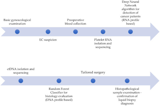 Liquid biopsy, being a minimally invasive alternative to surgical tissue biopsies, has recently revolutionized cancer diagnostics. This type of analysis is typically achieved using a blood sample. The procedure enables interrogation of tumor-derived material such as circulating tumor cells (CTCs), circulating tumor DNA (ctDNA), circulating free RNA (cfRNA), tumor-derived extracellular vesicles (EVs), and more recently, tumor educated platelets (TEPs), all present in the body fluids of cancer patients [1,2]. So far, mutational burden [3] and methylation pattern in ctDNA [4], along with circulating miRNA signatures [5], were used for screening and diagnosis of EC. Liquid biopsies as a diagnostic tool are expected to predict: (a) tumor aggressiveness with ctDNA level determination [6]; (b) relapse with ctDNA mutational profiling [7]; (c) recurrence risk using EV annexin A2 and L1CAM level analysis [8]; and (d) immunotherapy response by assessing microsatellite instability [9].