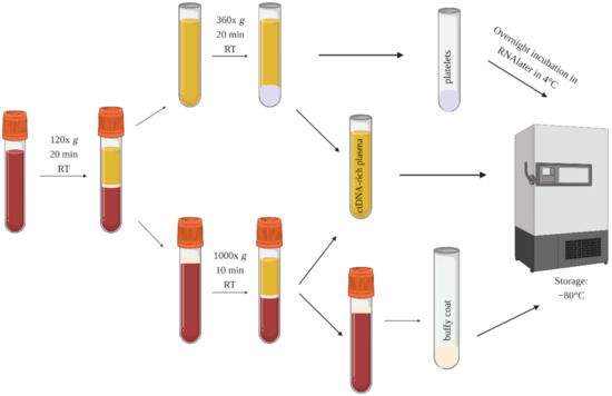 Figure 2. The blood processing protocol for the collection of platelets, ctDNA-rich plasma (somatic mutations), and buffy coat (germline mutations).